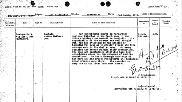At the time Arthur won the Military Cross, the 4th Division was involved in the battle of Polygon Wood and then the third battle of Ypres, Passchendaele. It is from the Ypres-Passchendaele area that we get the iconic images we have of trench warfare in a landscape of deep mud and water filled shell holes with broken off toothpick trees, stretching away into a hazy distance; where falling off the duck board paths meant drowning in mud. By the time Passchendael was captured in November 1917, the Australians had fought for eight weeks and suffered over 38 thousand casualties.