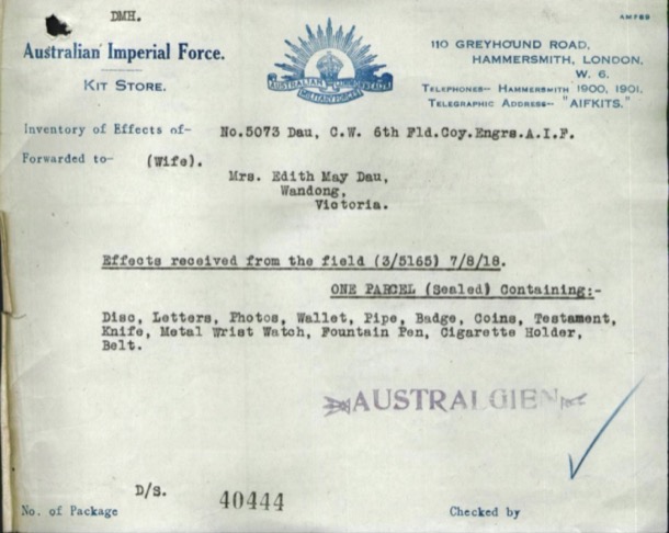Walter Albert Edward Dau the third youngest and according to Marge and Alice ‘the black sheep of the family’ enlisted in the AIF in November !916. Wally’s medical record describes him as having fair hair and blue eyes. He was twenty-seven, unmarried and a motor driver by occupation. He sailed for England in March 1917 with reinforcements for the 21st Infantry Battalion and he returned to Australia in October 1922, where he was discharged from the Army in December of that year. On the tapes Marge and Alice recall that he was apparently a bit bookish and lived ‘as a bit of a hermit in Noogee.’ He died in 1974 maybe in Queensland.