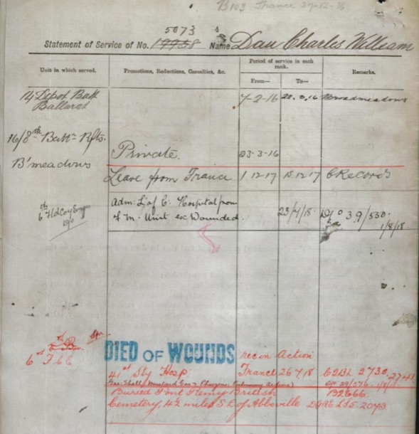 He was wounded in action on August 8th. At that time his company, the 14th Field Company Engineers was laying wire barriers across the area to be advanced upon in front of the village of Villers Brettoneux. They were harassed by constant German shellfire, and snipers.