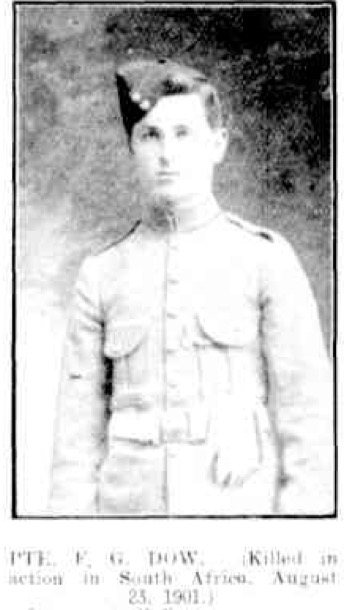 We don’t have much detail about Frederick’s death, but Lord Kitchener, Field Marshall in charge of the war, reported in one of his dispatches: "on the 23rd August Lieutenant Colonel Pulteney had a sharp engagement with the enemy on the west side of the Schurveberg, in which the Victorian MR (Mounted Rifles) had 2 men killed and 5 wounded.” One of those two men killed was Frederick Dow.