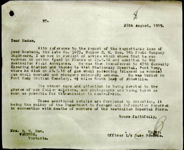 ‘Please inform me where to write to Walter Dau, Australian subject’ involved in “War Grave Construction work in Belgium, who sailed from England to Australia in 1922. I should be very much obliged if you would supply me with information as to the whereabouts of this person who is the father of my daughter, ……. in order to define her position and nationality.’