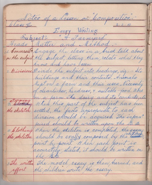 When the skeleton is completed, the essay should be orally composed by the children, point by point. When each point is accurately stated, it should be written on the B.B.