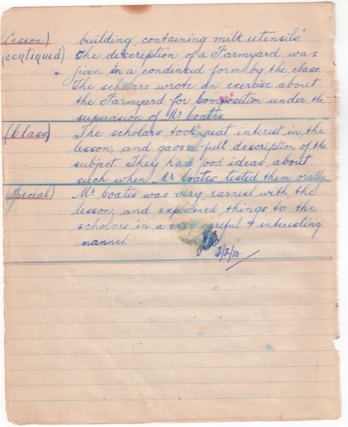 (Lesson) (continued) building containing milk utensils." The description of a Farmyard was given in a condensed form by the class. The scholars wrote an exercise about the Farmyard for Composition under the supervision of Mr Coates.