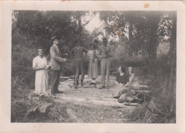 Down at the creek. From left to right (we think): Auntie Beat, Uncle Bill, Rob, Pat, Doug and a neighbour or visitor: