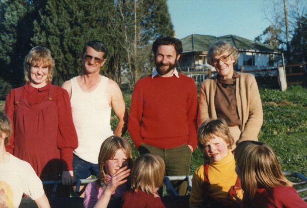 This photo was taken in 1983. In the background is the old farm house. Back row from left to right: pregnant Margaret, John, Jono and Alice, our mother.