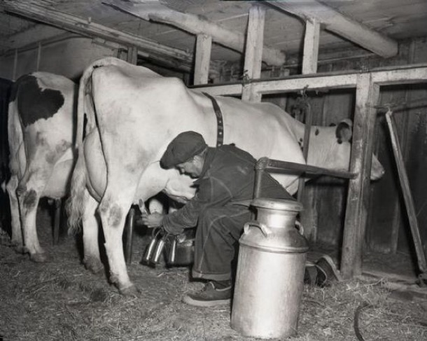 In turn they filed into the dairy, and into one of the six milking stalls, and the noisy diesel powered machine cranked up. The teats were washed with an old towel in a bucket of soapy water, a loose chain was put under the tail around the rump, and a set of shiny metal tubes was attached to each udder, with audible sucking sounds.