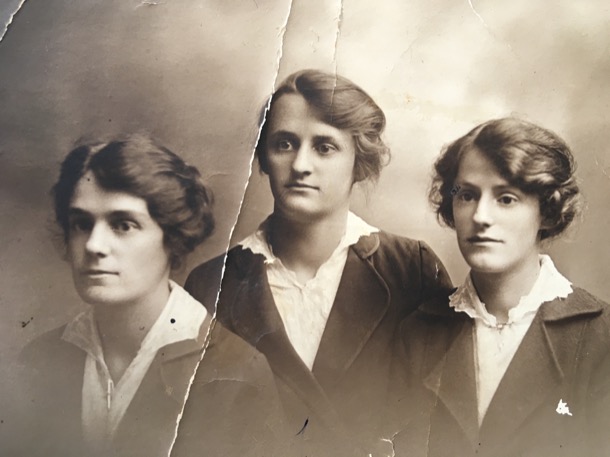 These three young women are our grandmother Alfreda on the left, with her two younger sisters, Beatrice in the middle and Berta on the right.