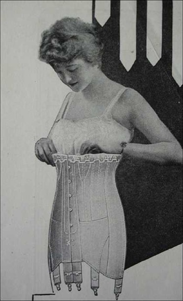 And underneath she would have worn a body moulding corset. Bras, which supported rather than moulded, were in their infancy at this time. They were patented in 1914.