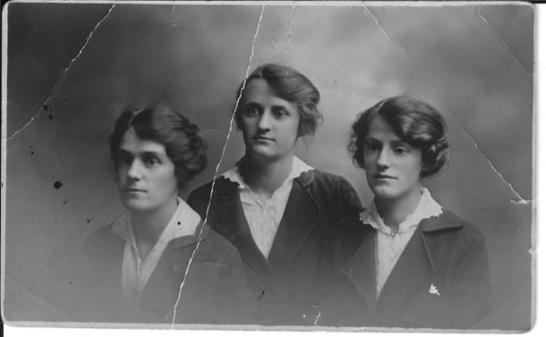 These three young women, probably photographed just before the first world war are (left to right) Alfreda, Beatrice and Berta Holm. Alfreda, our maternal grandmother, was the oldest of the three, perhaps just twenty at the time. The three sisters have their long hair swept back in gentle waves, to a loose bun or twist at the back.