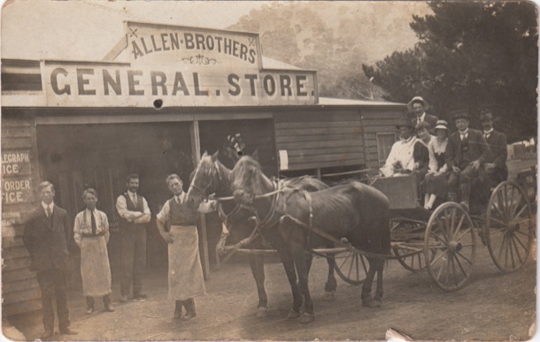 Out the front of the Eildon Weir store. Alf in a suit at the extreme left.