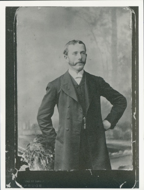 Alfred John Coates, born in 1857, was probably in his late twenties when this photo was taken. He was our maternal great grandfather and was a Methodist Pastor for most of his working life. In this photograph Alfred is a young man in prime of life, dressed in formal dress and sporting the fashion of the day: mutton chop whiskers, carefully manicured to join artfully with the moustache. A man of destiny, the misty ‘bush’ behind him, he stands erect, eyes on the future. At this time Alfred was apparently a boiler maker in Ballarat.