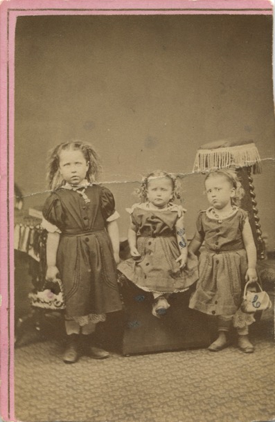 The first question we had was, "Were the three photos taken at the same time?". There is such a family resemblance, we weren’t sure at first whether they were different people in the three photos. The carpet gives away that they were taken in the same studio. On the back of one of the playing card sized photos, we see “one shilling per copy”. For context, at that time, a shilling was more than a day’s wage for a working man.