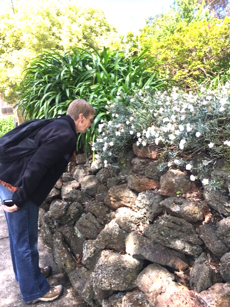 A grey wooden fence was about two and a half metres away, outside the kitchen window. A double row of hand laid red bricks made the driveway, with a narrow garden bed each side. Under the window were red geraniums and blue campanula climbed the fence. The Soames' garden next door had fragrant mock orange and honeysuckles trees, whose perfume would waft in on the breeze. Most nights, from a very early age, Sue and I stood at that window and washed and dried the dishes.