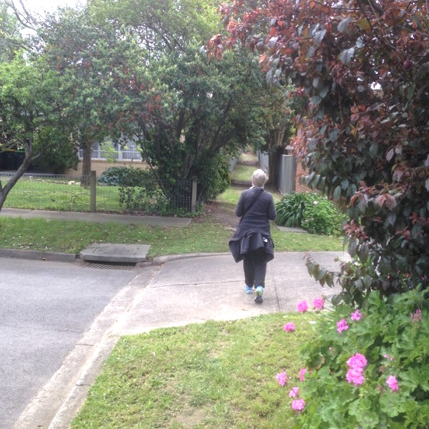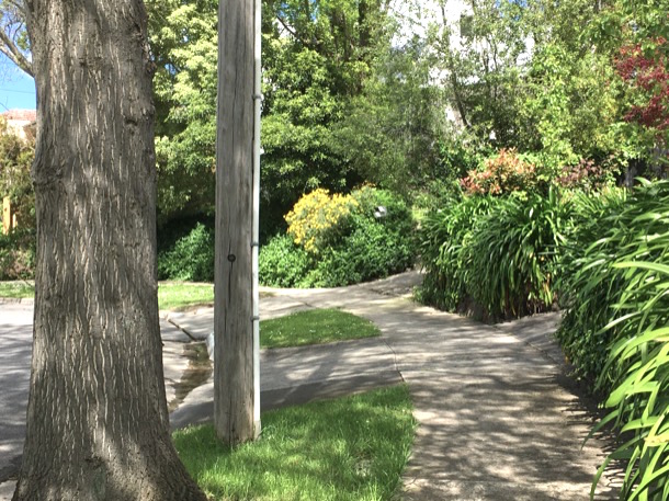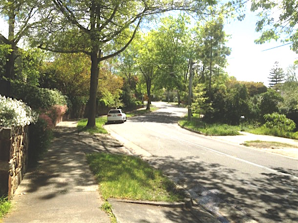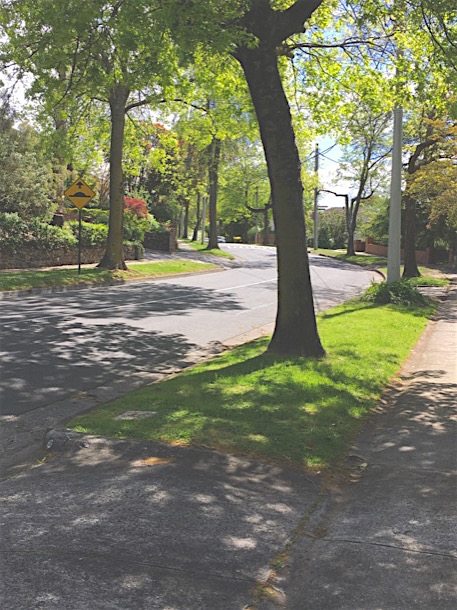 The lane takes us to the same place, the corner of Riversdale and Grandview roads, but it is much less steep. Soon we are crossing Riversdale Road and we remember the leafy cool shade of this part of the journey. It has seemed like a long way and we find ourselves trudging a bit up the hill.