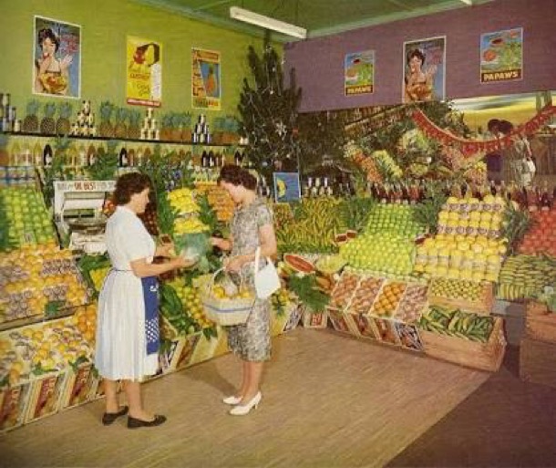 Our mother walked to the local grocer, fruit shop and butcher once a week where the rest of the food was bought.The shopping was delivered to our house until we bought a car. From then on the shopping was collected by our father on his way home. The butcher and greengrocer were much the same as today, except that the butcher had sawdust on the floor and there was not a piece of cling wrap plastic to be seen. The grocer however was very different.