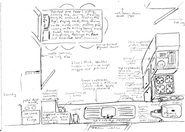 The kitchen table at Moore St was the centre of the house and its large plywood surface saw many varied activities besides breakfast, lunch and dinner. It hosted our mother reading theThe Age from cover to cover and then playing Patience; (instead of doing more mundane tasks like housework) sewing all manner of things from trailer covers, curtains and summer clothes; lots of talking and even a seance or two in later years.